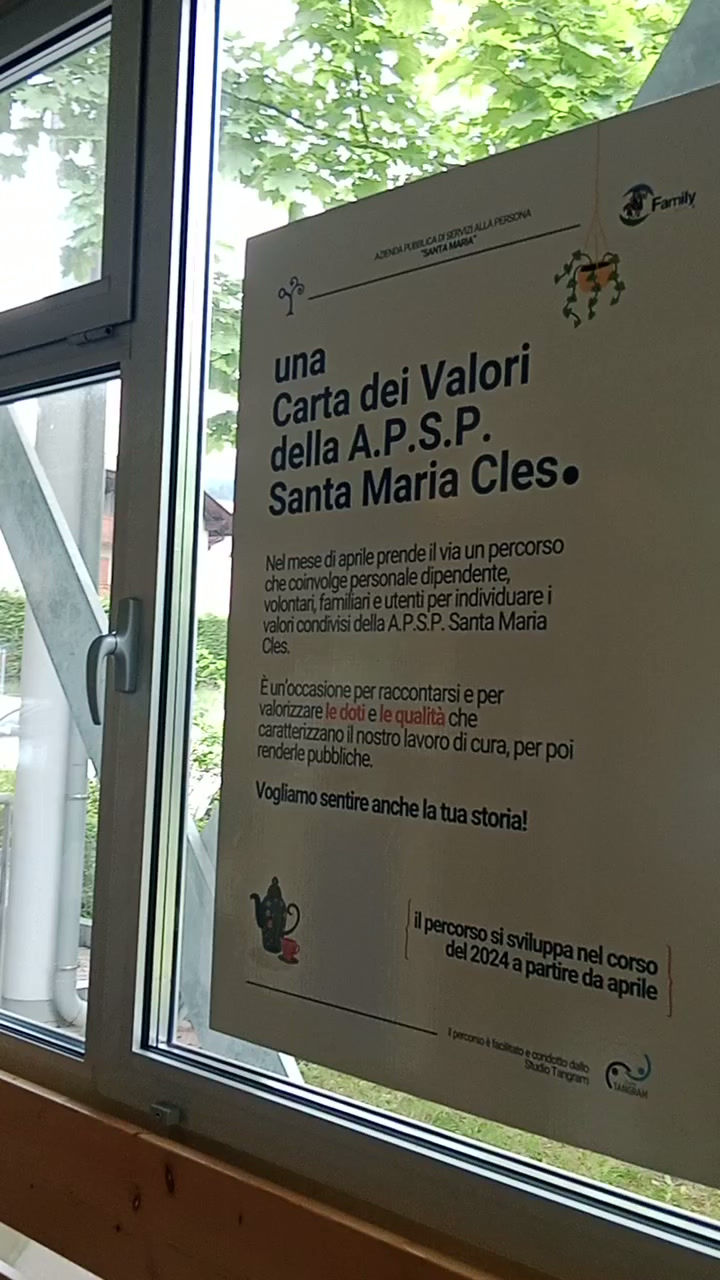 Un percorso di ascolto e di emersione dei valori che fondano l'attività socio-assistenziale di una APSP del territorio, molto attiva nella comunità, che attraverso questo strumento voleva consolidare lo spirito di appartenenza, la consapevolezza legata all'etica e alla qualità del lavoro professionale e non che si porta avanti nella casa. Un percorso multi livello che ha coinvolto amministratori, personale dipendente e volontari nel corso di sette mesi.